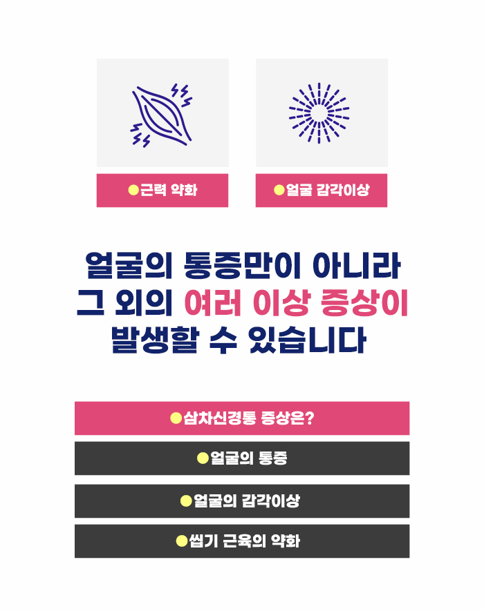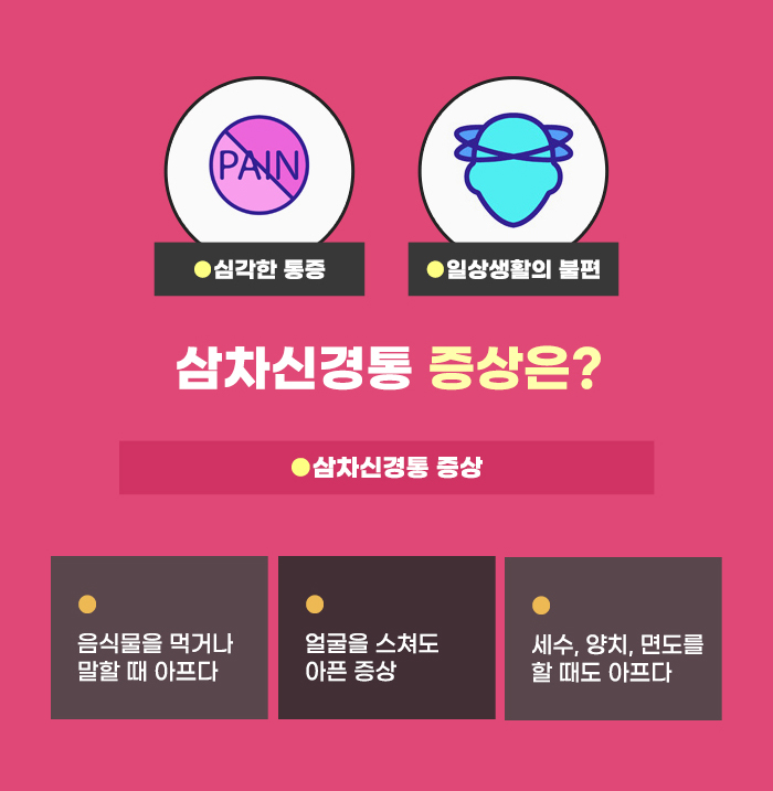 얼굴에 생기는 또 다른 문제로 삼차신경통이 있습니다. 삼차신경통은 얼굴 부분에 마비가 생기는 구안와사와 다르게, 얼굴 부분에 통증이 생기는 문제라고 하는데요, 머리와 얼굴의 감각을 뇌에 전달하는 신경에 이상이 생기게 될 경우, 작은 자극도 크게 느낄 수 있습니다. 이런 이유로 인해 얼굴에 강한 통증을 느끼며 고생할 수도 있다고 합니다.