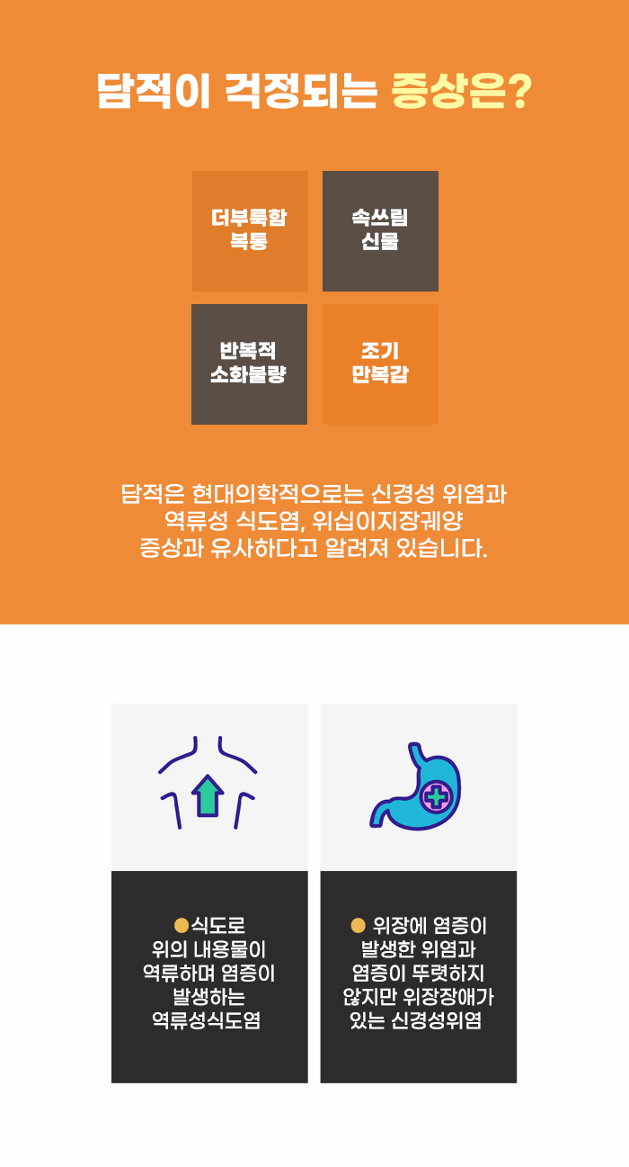 그리고 담적에 대해서 걱정하는 분 중에는 잦은 복통, 복부팽만, 가스가 차고 방귀가 자주 나오는 증상, 배변 후 시원하지 않은 잔변감 등의 증상으로 고민하는 분도 있습니다. 또한 배변 활동이 원활하지 않은 것, 너무 자주 설사하는 것, 변비로 3일에 1번 이하로 배변을 하고, 배변 과정이 너무 힘든 것 같은 증상으로 어려움을 겪는 분도 있다고 합니다.