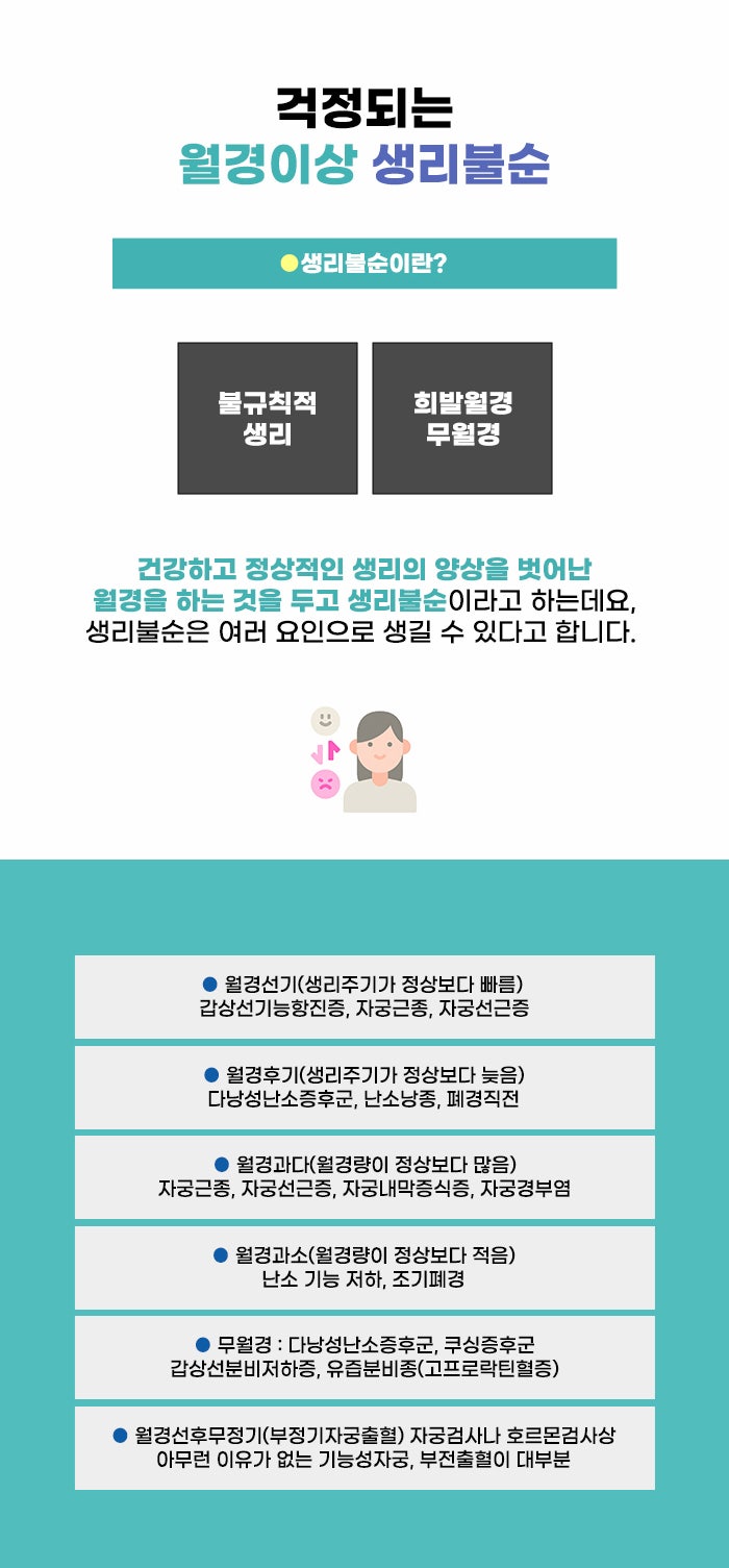 생리통과 관련이 있는 자궁선근증이나 자궁내막증은, 생리통 증상 말고도 다양한 생리 이상 증상과 연관성이 있다고 하는데요. 생리 기간이 불규칙한 것, 생리량이 너무 많은 것, 생리량 정상적인 것보다 너무 적은 것 등의 증상이 있는 경우에도 자궁 질환에 대해서 걱정될 수도 있다고 합니다. 생리통 증상과 함께 생리주기 문제, 생리량 문제, 무월경이나 희발월경 문제 등이 있을 경우 걱정되는 증상을 그냥 참지 말고 자기 몸과 건강에 관심을 가졌으면 좋겠습니다.