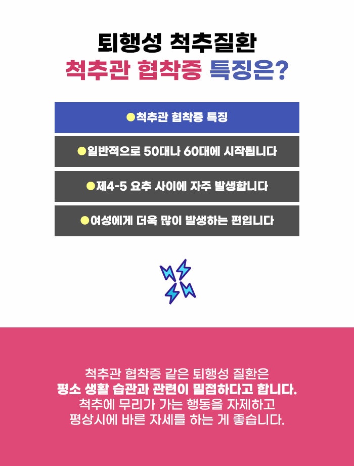 그리고 척추가 전방이나 후방으로 휘면서 척수와 신경근을 누르고 혈류 장애를 일으키며 증상이 나타날 수도 있다고 합니다. 천안허리통증병원추천 정보 고민되는 퇴행성 척추관 협착증의 경우 운동량이 많은 요추, 경추에서 생기는 경우가 흔한 편이라고 합니다.