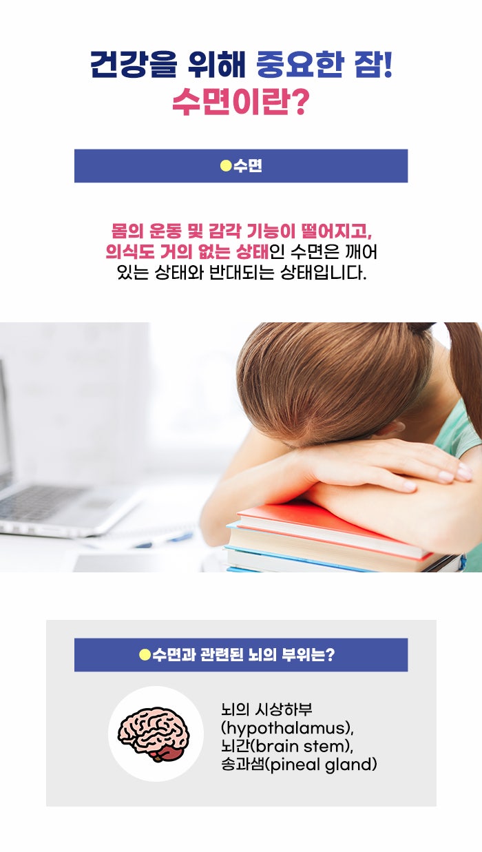 잠이라는 것은 어떤 것이고 왜 중요할까요? 잠은 눈이 감기고, 맥박이나 호흡 등 생명을 유지하기 위한 최소한의 활동만을 하는 시간입니다. 외부의 자극에 둔감해지게 되고 무방비한 상태가 되는데요. 다만 외부의 자극이 주어질 경우 빠르게 깨어날 수 있는 게 혼수상태와 다르다고 합니다. 이런 잠은 뇌의 시상하부, 뇌간, 송과샘 등의 부분과 연관성이 크다고 알려져 있는데요.