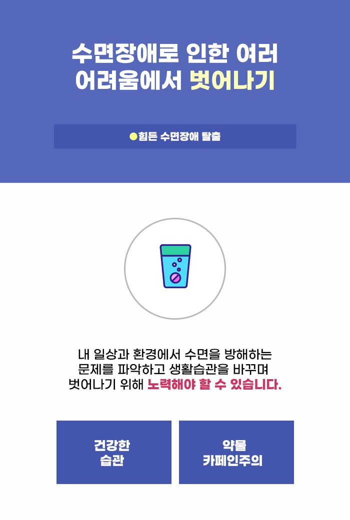 한 달 이상 지속적으로 수면에 어려움을 겪는 상황이라면 알게 모르게 체력도 떨어지고 일상생활에서 어려움을 겪고 있을 수도 있습니다. 그렇기에 이런 증상을 오래 방치하지 말고 나를 위한 시간을 가지면서 수면장애에 대해서 알아보셨으면 합니다. 또한 잠들지 못하는 것 말고도 몽유병이나 야경증, 수면무호흡증후군 등 수면과 관련해 생기는 여러 문제가 있는데요. 걱정되는 점이 있을 경우 꼼꼼히 파악하고 일상의 질을 지키셨으면 합니다.