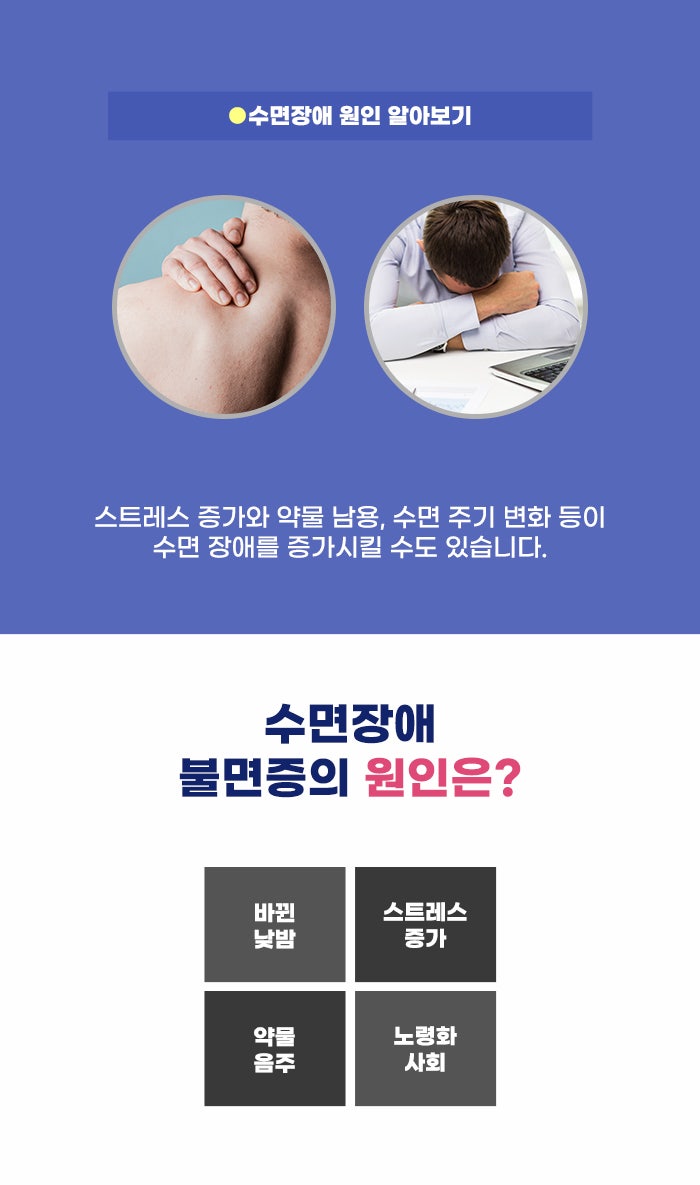 잠을 자려고 누웠는데도 잠이 오지 않아 걱정하거나, 긴 시간을 들였는데도 잠에 들지 못해 힘들다면? 수면장애는 잠과 관련되어 생기는 여러 문제를 말하는데요. 그중에서 불면증 문제가 많은 사람에게 알려진 수면장애 문제일 것 같습니다. 불면증이라고 하면 수면 시간이 부족한 것만을 떠올리는 분도 있습니다.