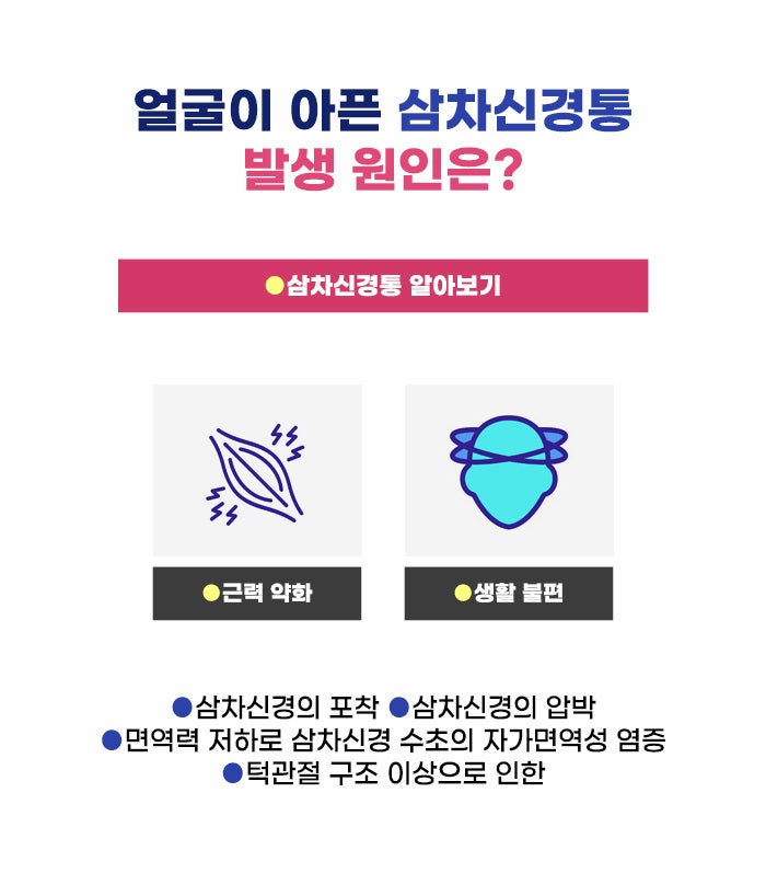턱이 아프고 입을 벌리기 어려운 턱관절장애는 목과 주변 근육을 긴장시키고 삼차신경의 압박으로 인해 생기는 통증에도 영향을 줄 수도 있다고 하는데요. 얼굴과 머리에서 오는 감각을 뇌로 전달하며, 정상적으로 감각을 느끼도록 해야 하는 신경이 삼차신경입니다. 그런데 턱관절 장애나 여러 이유로 이 신경이 압박을 받고 염증이 생기면서 얼굴 통증이 생길 수도 있다고 합니다. 현재 턱관절장애 문제가 의심될 경우 꼼꼼히 이상을 살펴보길 바라겠습니다.