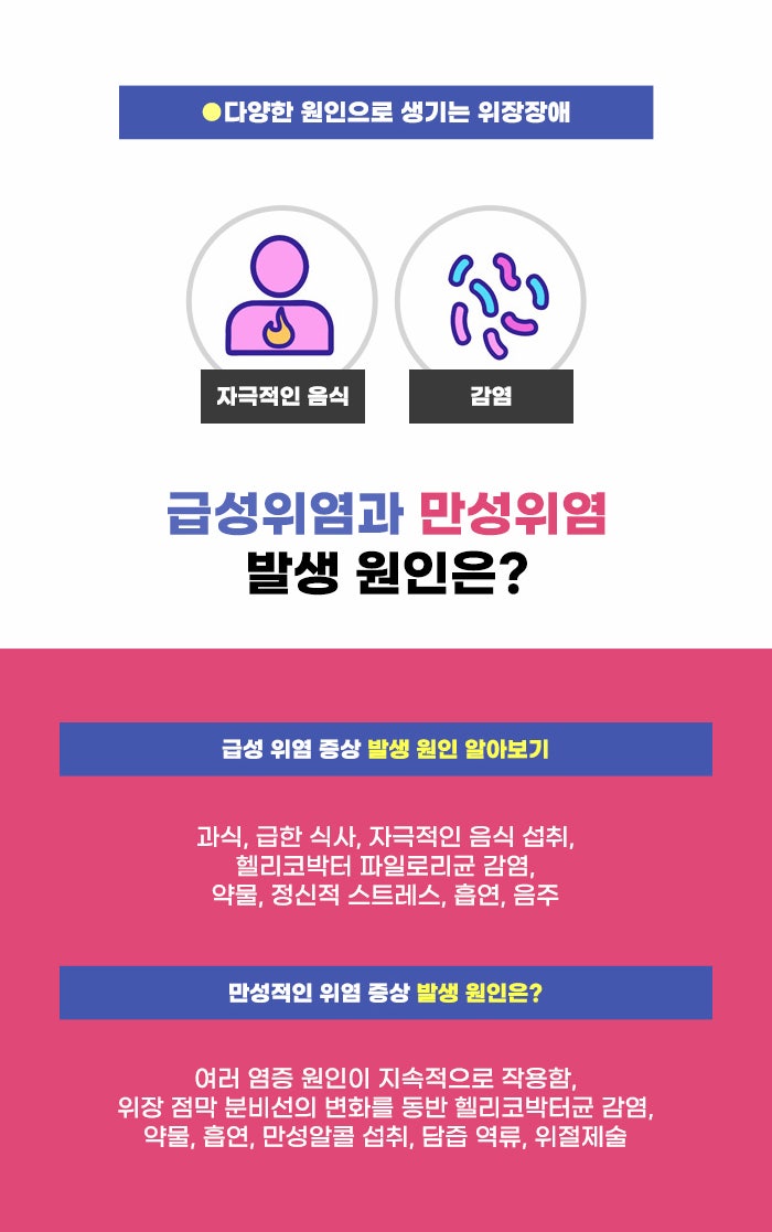 많은 분이 자극적인 음식, 음주 그리고 헬리코박터균 감염 등의 이유로 위장장애를 겪고 있습니다. 특히 우리나라는 바쁘고 스트레스를 받는 환경에서 살아가는 분이 많은 것 같은데요. 긴장된 상황에서 근육이 수축하며 식도 역류 문제나 소화 장애 문제 등을 겪는 경우도 적지 않다고 합니다. 중장년, 노년층은 물론 청년층과 청소년층도 위 건강 문제에서 예외는 아니라고 하는데요. 긴 시간 위염 문제로 고생하지 않게 위 건강에 관심을 가졌으면 좋겠습니다.