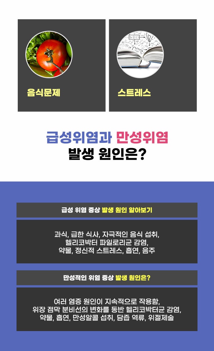 급성 위염 원인이 오래 몸에 작용하면서, 만성 위염 상태가 될 수도 있다고 합니다. 세균과 진균, 바이러스 등의 감염, 음주와 흡연, 약물 복용 등도 위염의 원인이라고 알려져 있습니다. 특히 헬리코박터 파일로리균 감염은 만성 위염 증상 발생에 많은 영향을 준다고 합니다.