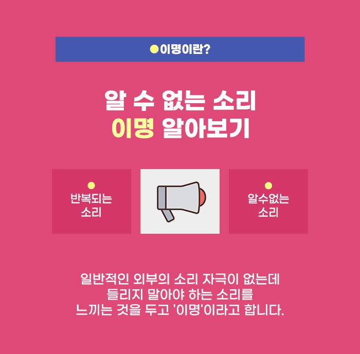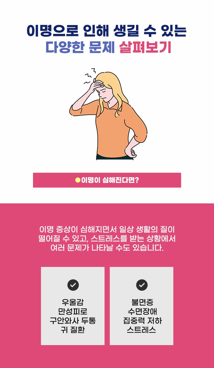 시간이 지날수록 내 몸에 생기는 이상, 고민이 더 커질 수 있기에 되도록 빠르게 나의 고민을 파악하는 게 필요할 것 같은데요. 반복되는 이명을 방치한다는 것은 이명 증상을 키운다는 뜻일 수도 있습니다. 그리고 이명을 불러온 원인, 귀 관련 질환을 방치하는 것일 수도 있다고 합니다. 이명은 원인 파악이 쉽지 않은 만큼, 세밀하게 문제를 알아봐야 하겠습니다.