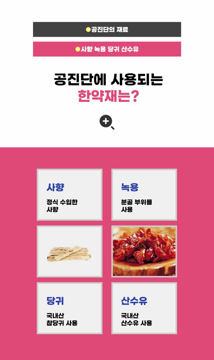 공진단을 찾는 분의 고민은 다양한데요. 음주가 잦고 스트레스를 많이 받으며 간 기능이 약해진 것 같다고 생각하는 분, 큰 수술을 마친 후에 이전에 비해 몸이 쇠약해졌다고 생각하는 분도 공진단에 대해서 알아보는 것 같습니다. 갱년기 증후군이나 노화로 인한 증상을 경험하는 분이나 스테미너가 떨어진 분, 집중력이 떨어지고 공부가 힘든 수험생 등도 공진단에 대해서 살펴보고 있는 것 같습니다.