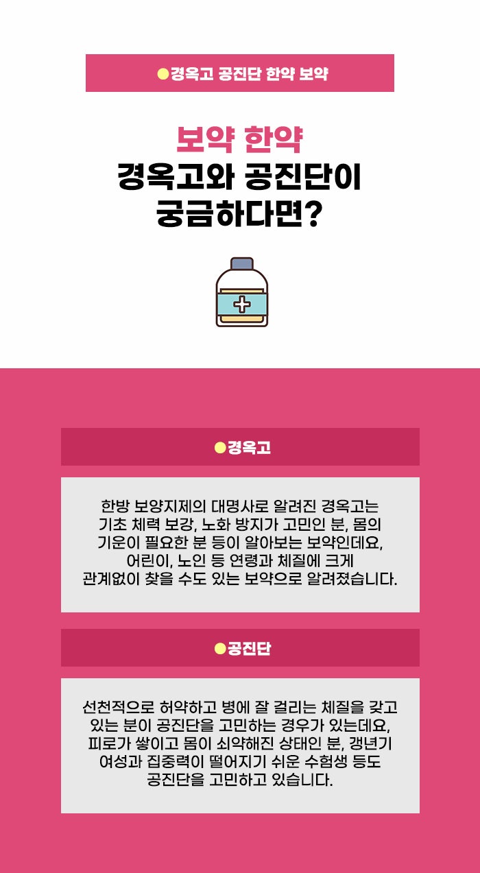 동의보감에 소개된 바가 있으며, 오랜 시간 동안 우리나라 사람들의 역사와 함께 해왔던 보약이 바로 경옥고, 공진단이 아닐까 싶은데요. 사향과 녹용, 당귀와 산수유 등의 약재를 사용한 공진단의 경우 체력이 선천적으로 약하고 허약한 경우, 집중력이 떨어지는 학생인 경우에도 궁금해하는 보약이라고 합니다. 그리고 경옥고는 성별이나 연령, 체질에 크게 상관없이 찾는 보약이라고 알려져 있습니다.
