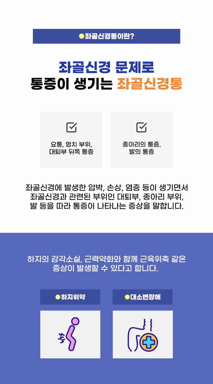 척추 질환 중 많이 알려진 것으로 추간판 탈출증이 있습니다. 좌골신경의 경우 요추 4번과 5번 신경, 천추 1번과 2번, 3번 신경이 모여서 형성되는 신경이라고 하는데요. 이 요천추신경과 관련되어 추간판 탈출증이 있을 경우 좌골신경통 발생과 연관이 있을 수도 있다고 합니다. 그리고 좌골신경 주변에 있는 근육의 과도한 긴장, 근근막통증 증후군, 척추관 협착증 등도 좌골신경통 문제의 원인으로 작용할 가능성이 있다고 합니다.