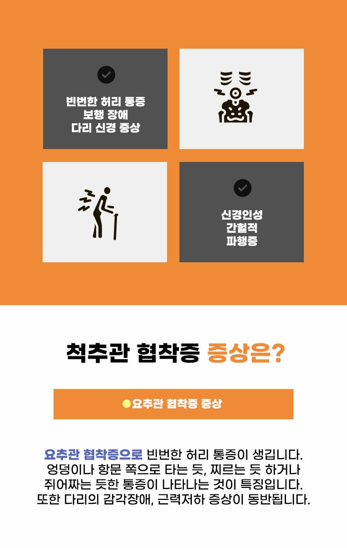 하지만 추간판 탈출증과 다른 척추관 협착증의 특징적인 증상이 존재하는데요. 바로 신경인성 간헐적 파행증입니다. 찔리는 듯하거나, 쥐어짜는 듯한 통증, 타는 듯한 통증이 항문, 엉덩이, 꼬리뼈 쪽에서 느껴지는데요. 활동하고 걸을 때 증상이 심해졌다가 가만히 쉬면 나아지는 편입니다. 그렇기에 협착 증상이 심해지면서 편하게 걷는 거리가 줄어들고 활동에 지장이 생기게 됩니다.