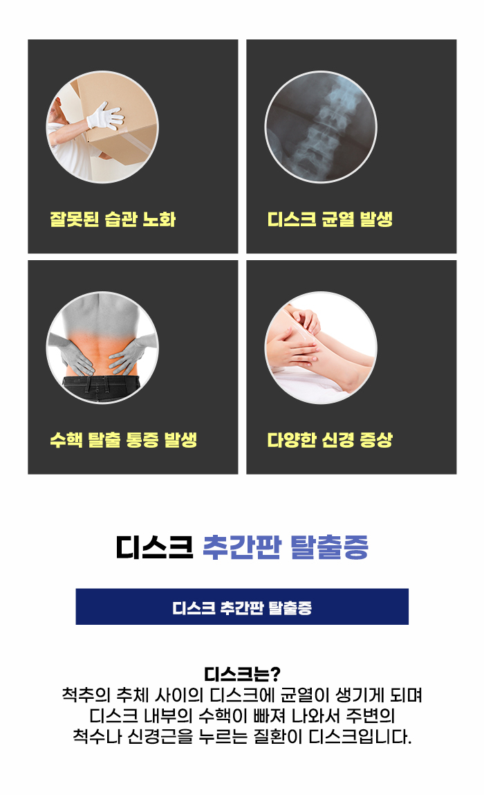 척추 질환으로 인해 많은 분이 어려움을 겪고 있는데요, 몸의 다른 부분에 이상이 생길 경우 휴식하면서 되도록 해당 부분을 사용하지 않을 수도 있습니다. 하지만 몸의 중심인 허리에 이상이 생길 경우 이런 휴식도 쉽지 않고 절대 안정을 취해야 할 수도 있습니다. 삶의 질이 크게 떨어질 수도 있기에 되도록 건강한 생활을 위해 힘쓰며 추간판 탈출증 악화를 경계하셨으면 합니다.