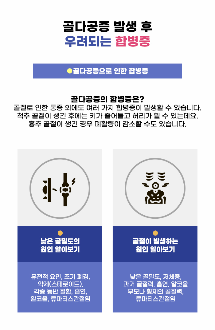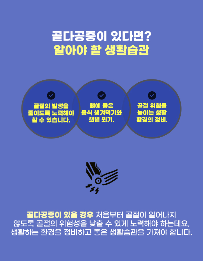 골다공증이 있을 때, 골다공증 자체만으로는 다른 이상을 느끼기 어려울 수도 있습니다. 하지만 작은 충격에 골절이 생기거나 뼈의 이상이 생기면서 문제를 알게 되기도 하는데요, 뼈의 손상이 생길 경우 그 자체만으로도 통증이 심하고 불편함이 생기지만 한 번의 골절으로만 그치지 않고 여러 번의 골절과 후유증으로 이어질 수도 있기에 주의해야 합니다.