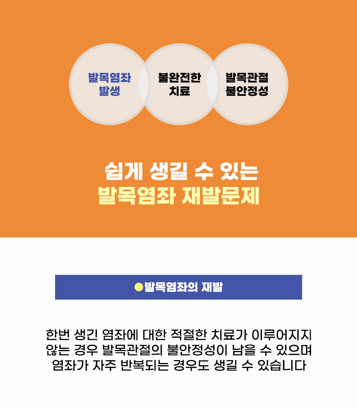 한 번 발생한 염좌 상태에서 적절한 대응이 이루어지지 않는 경우, 발목관절이 튼튼하게 나아지지 못하고 발목관절의 불안정성이 남을 수 있는데요. 그렇다 보니 계속 발목염좌가 반복되는 경우도 있다고 합니다. 발목염좌가 생긴 경우 되도록 바른 대응을 해야 합니다.