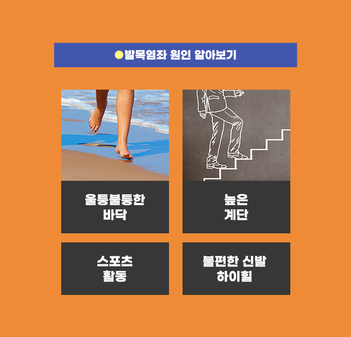 왜 발목염좌 문제가 생길까요? 발목염좌는 여러 상황에서 생길 수 있다고 하는데요. 높은 계단을 올라가거나 내려가는 상황에서 발목을 접질리며 통증이 생기기도 합니다. 또한 울퉁불퉁하고 고르지 않은 바닥을 걷거나 뛰는 경우, 장애물이 많은 바닥에서 서둘러 움직이는 경우에도 발목염좌가 생기는 사고를 겪을 수도 있습니다.
