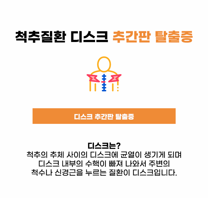 디스크는 다른 말로 추간판인데요, 척추의 추체 사이에 있는 부분이 디스크로, 이 디스크는 겉의 질긴 섬유륜, 그리고 내부의 수핵으로 나눌 수 있습니다. 디크스에 과도한 압박이 주어질 경우 섬유륜 부분이 찢기고 내부에 있는 젤리 같은 수핵이 밀려나올 수 있는데요, 이 수핵이 주변의 신경근을 자극하고 염증과 통증, 신경 증상 등이 발생하는 질환이 바로 추간판 탈출증, 디스크라고 합니다.