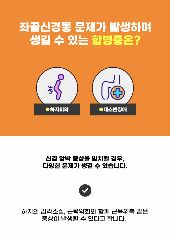 좌골신경통 문제가 있는 경우, 시간이 지나면서 더 큰 문제가 발생할 가능성도 있습니다. 처음에는 가벼운 통증이 있었는데 시간이 지나면서 더 통증이 심해지기도 하고 신경 증상이 악화될 수도 있는데요, 하지의 감각 소실을 겪는 경우도 있으며 근력 약화를 겪는 경우도 있다고 합니다. 또한 근육 위축 등의 증상을 겪는 경우도 있다고 합니다.