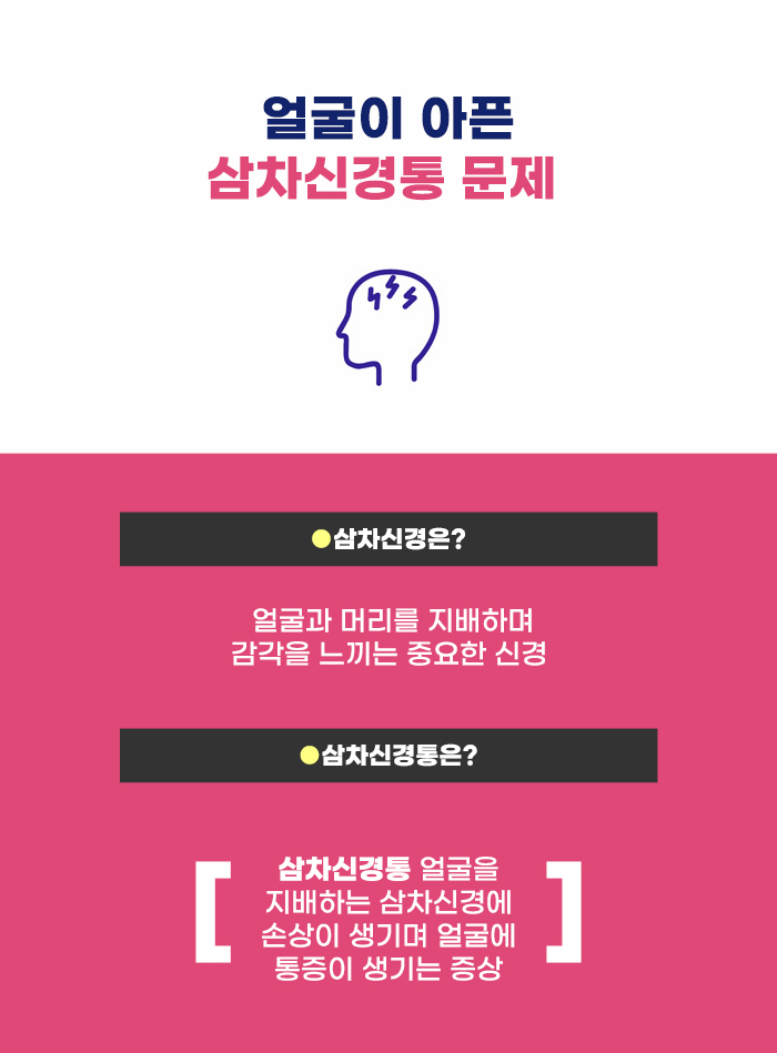 얼굴에 생기는 또 다른 문제로 삼차신경통이 있습니다. 삼차신경통은 얼굴 부분에 마비가 생기는 구안와사와 다르게, 얼굴 부분에 통증이 생기는 문제라고 하는데요, 머리와 얼굴의 감각을 뇌에 전달하는 신경에 이상이 생기게 될 경우, 작은 자극도 크게 느낄 수 있습니다. 이런 이유로 인해 얼굴에 강한 통증을 느끼며 고생할 수도 있다고 합니다.