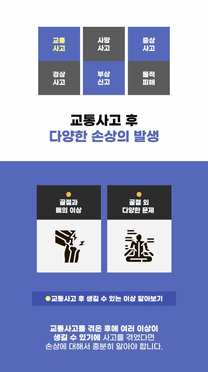 교통 법규의 변화, 사회적 노력, 교통사고에 대한 경각심 변화 등 다양한 노력이 더해지면서 교통사고 사망자 수가 줄어들고 있다고 하는데요, 하지만 여전히 자동차 사고는 우리나라의 많은 분을 힘들게 하는 사고입니다. 교통사고를 겪었을 때 x-ray 검사를 받아보면서 이상을 파악하는 경우가 있습니다. 이때 골절이 없다고 해도 교통사고 손상이 없는 것은 아닙니다.