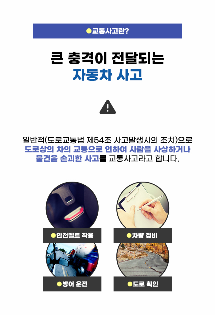 도로교통법의 규정에 의한 도로에서 일어나는 차량에 의한 사고, 혹은 불특정 다수의 통행을 위해 공개된 장소에서 생기는 차량에 의한 사고가 바로 자동차 사고라고 합니다. 교통사고는 우리나라 각지에서 지금도 일어나고 있는데요, 차량이 존재하는 곳이라면 어디에서든 생길 수 있는 만큼, 자동차 사고와 관련해 고민을 갖고 있는 분도 많은 것 같습니다.