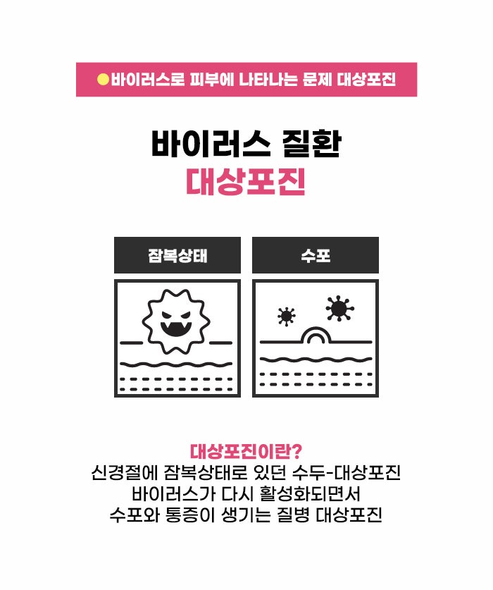 바이러스성 질환이면서, 피부에 특징적인 병변이 나타나는 다른 질환으로 대상포진이 있습니다. 이 질환은 수두-대상포진 바이러스에 의해 생기는 것이라고 하는데요, 몸이 약해진 상태에서 수두-대상포진 바이러스가 활성화되며 생긴다고 합니다. 띠 모양으로 수포가 생기고 통증이 생길 수 있는데요. 수포가 사라진 후에도 신경통 후유증을 남길 수도 있다고 합니다. 약해진 몸 상태에서 여러 피부 증상이 나타날 수 있는데요, 그렇기에 평소 면역력을 잘 챙기는 것도 중요하겠습니다.