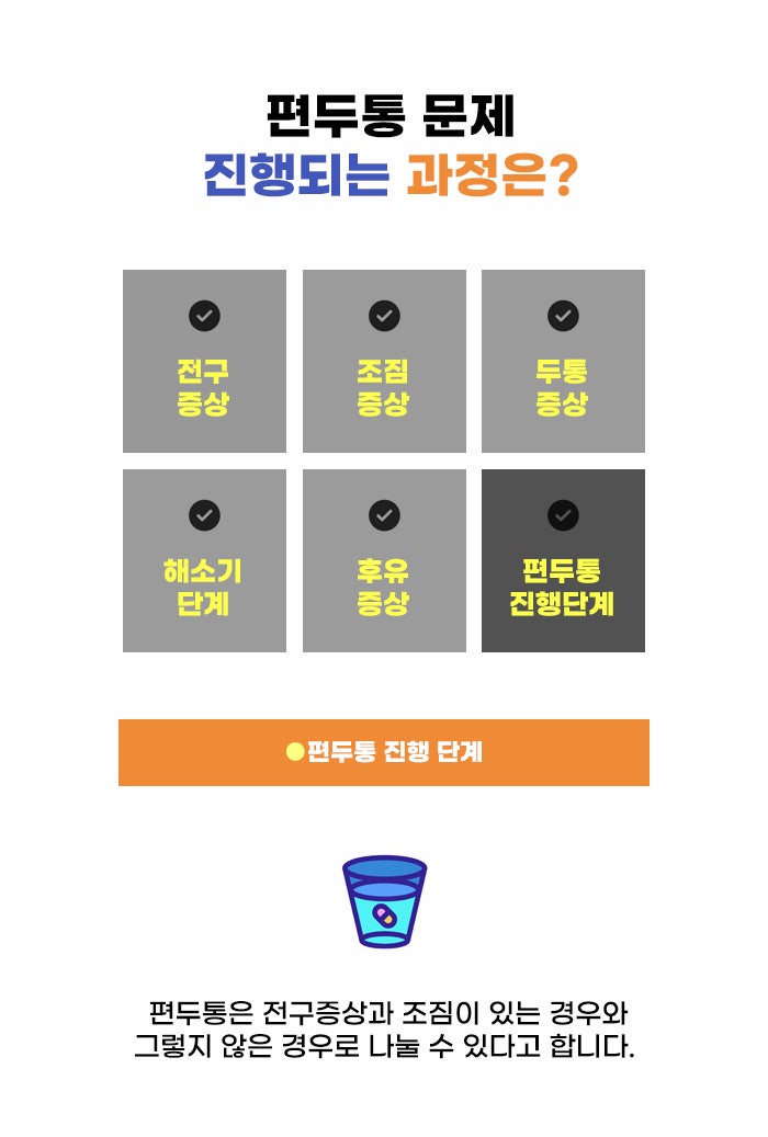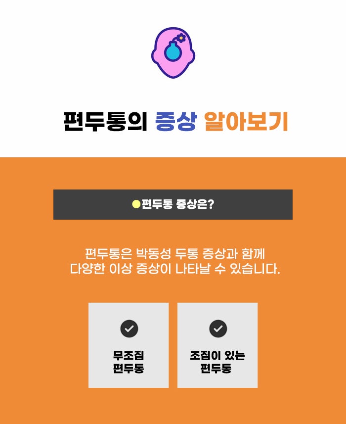 편두통은 일상생활에 방해가 될 정도로 두통이 심하며, 박동성 두통, 구역, 구토, 소리 공포증이나 빛 공포증을 동반하는 두통을 말합니다. 편두통의 진행 단계는 전구증상-조짐-두통과 동반증상-해소기-후유증상으로 나눌 수 있다고 하는데요. 이 중에서 조짐이 있지 않은 무조짐 편두통을 겪는 분이 더 많다고 합니다.