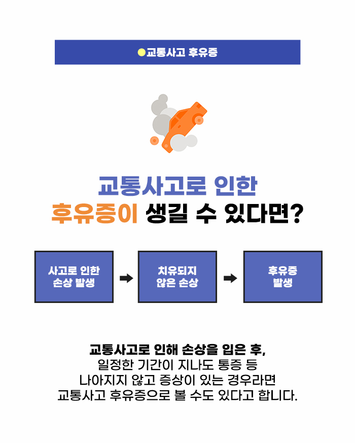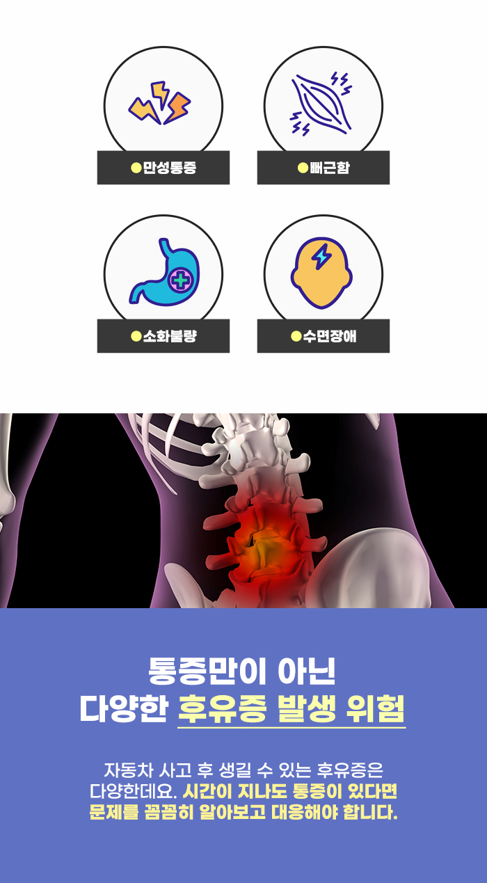 교통사고 규모에 따라서 작은 규모의 사고, 보이지 않는 정도의 손상을 입은 후에도, 이후 생각지 못한 만성 통증, 피로 등의 후유증이 남을 가능성이 있다고 합니다. 특히 몸의 이상에 대해서 잘 모르는 상태에서, 일상생활을 하며 받은 스트레스와 피로가 더해지면서 후유증을 겪을 수도 있다고 하는데요, 시간이 지나도 통증이나 문제가 사라지지 않는 것 같다면 후유증에 대해서 살펴보셨으면 합니다.