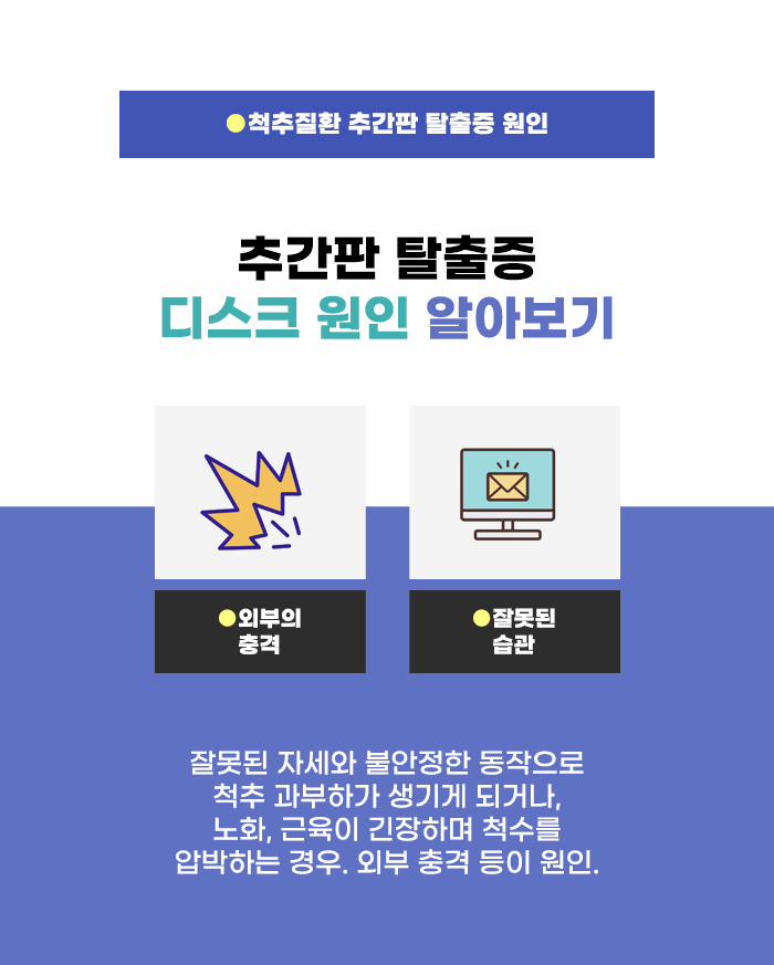 교통사고는 몸에 강한 충격이 전달되는 사고입니다. 그리고 사고 당시 몸이 이리저리 흔들리고, 특히 목이 꺾이고, 허리에 충격도 가게 되는데요. 이런 편타성 손상으로 인한 척추 질환이 발생하거나, 혹은 원래 있었던 척추 문제가 악화될 가능성도 있다고 합니다. 척추 질환 중 대표적인 것이 추간판 탈출증인데요, 추간판의 영어 이름을 따서 간단하게 '디스크'라고 불리는 경우도 많습니다.
