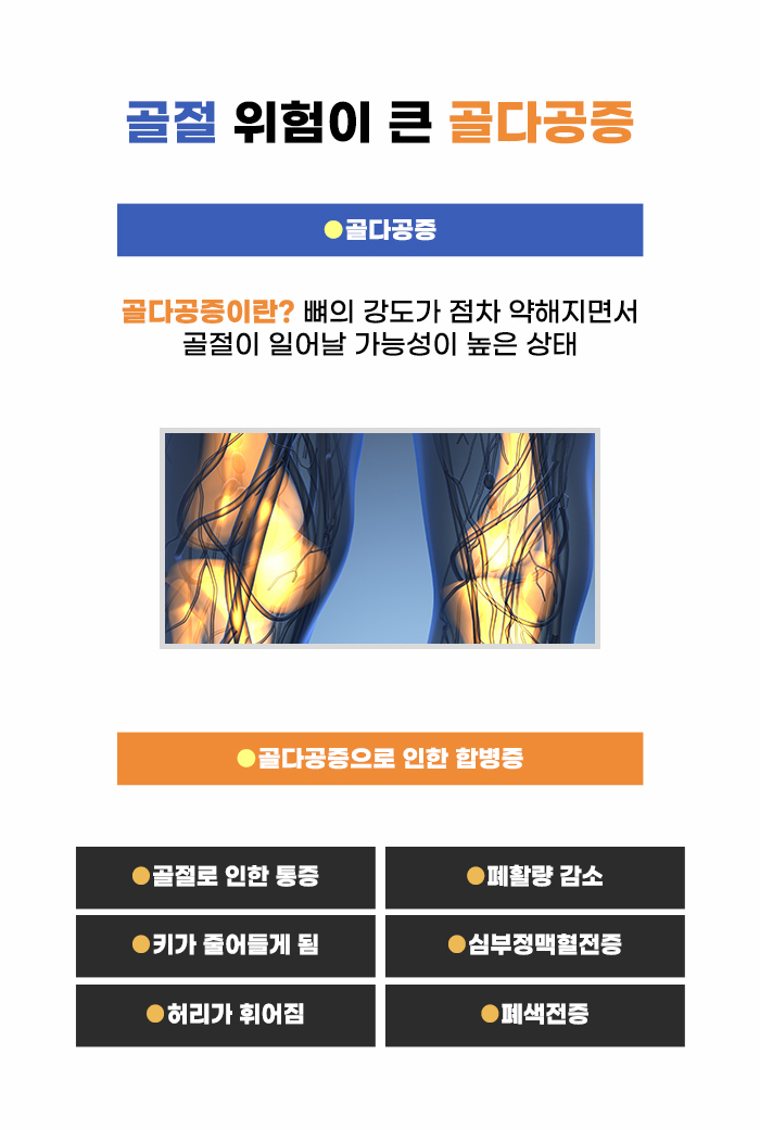 그리고 같은 교통사고를 겪더라도, 다른 사람에 비해 손상이 큰 사람이 있을 수 있는데요. 사고 당시 상황과 좌석 등에 따라서도 다르지만, 골밀도가 낮아진 분이라면 더욱 골절 같은 큰 부상을 입을 수도 있다고 합니다. 특히 뼈가 약해지고 골밀도가 낮아지며 골절이 쉬운 상태가 되는 것을 두고 골다공증이라고 하는데요, 골다공증은 예방과 부상 방지가 중요하다고 하니 평소 뼈 건강에도 관심을 가졌으면 합니다!
