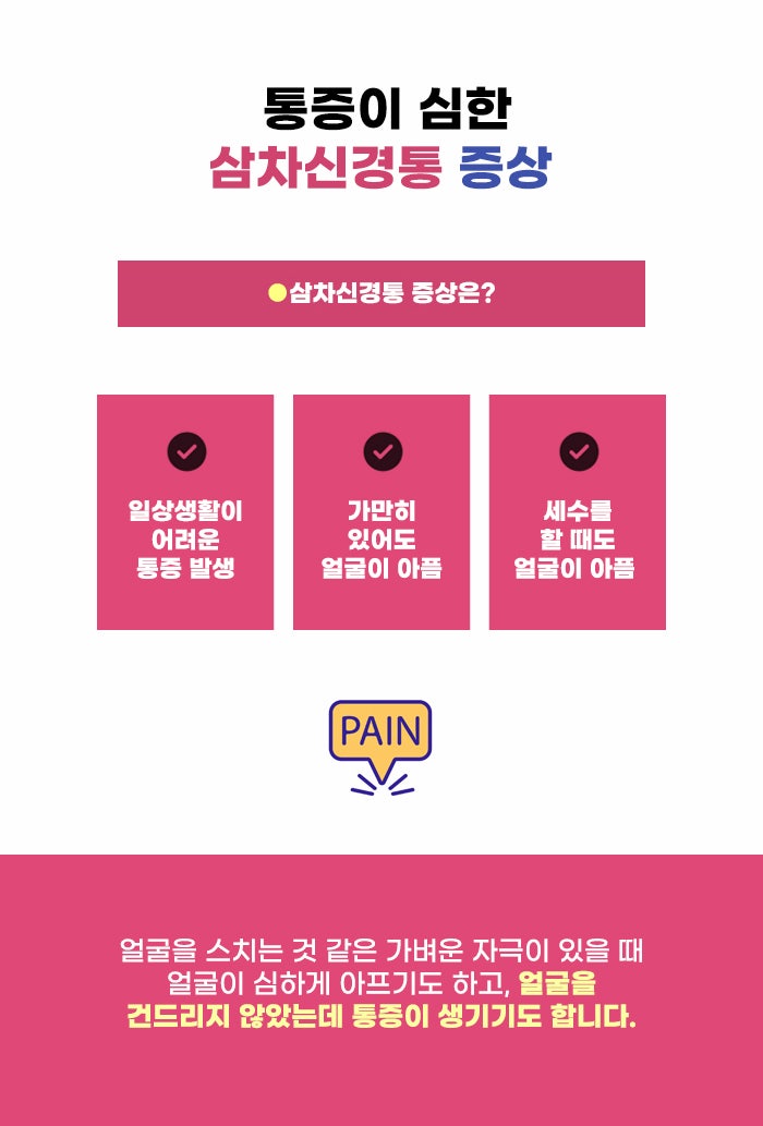 원래대로라면 느끼지 않아도 되는 통증을 느끼는 게 삼차신경통인데요, 특히 예민한 얼굴 부분이다 보니 더욱 그 고통이 클 수도 있다고 합니다. 얼굴에 생긴 문제로 걱정하는 분이라면 시간이 더 흐르기 이전에 증상이 발견된 초반부터 꼼꼼히 문제를 파악할 수 있었으면 합니다!