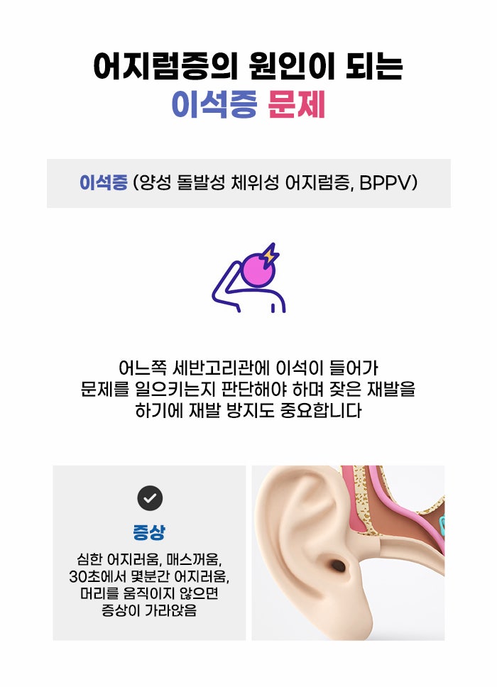 그리고 세상이 빙글빙글 돌거나, 중심을 잡지 못하는 어지럼증의 경우에도 여러 요인으로 생길 수 있다고 하는데요, 스트레스, 피로 등으로 인해 생기기도 하지만, 이석증으로 인해 어지럼증을 겪는 경우도 있습니다. 이석증은 귀 안의 이석이 이탈해 생기는 문제인데요, 특히 재발이 쉬울 수 있어 주의해야 한다고 합니다.