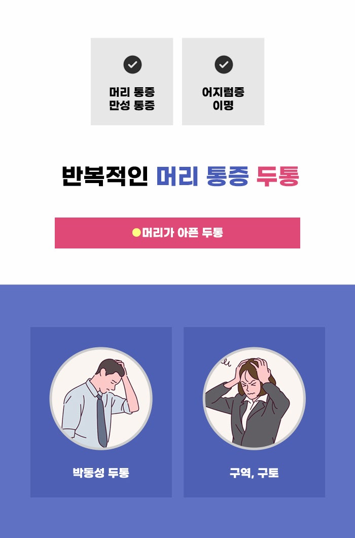 그리고 통증을 전달하는 통로인 신경의 문제로 통증을 느끼는 신경병성 통증인지 확인해야 하는데요. 그런데 이런 이유로 통증이 생기기도 하지만, 통증으로 고생하고 있어도 통증의 원인을 확인하기 어려운 경우도 있습니다. 이 경우 기능적 통증, 특발성 통증이라고 부르기도 합니다. 천안머리 어지럼 두통 정보 고민되는 편두통의 경우에는 일상생활에서 어려울 정도로 머리 통증을 겪으며 구역, 구토 등의 증상이 나타나는 게 특징이라고 합니다.