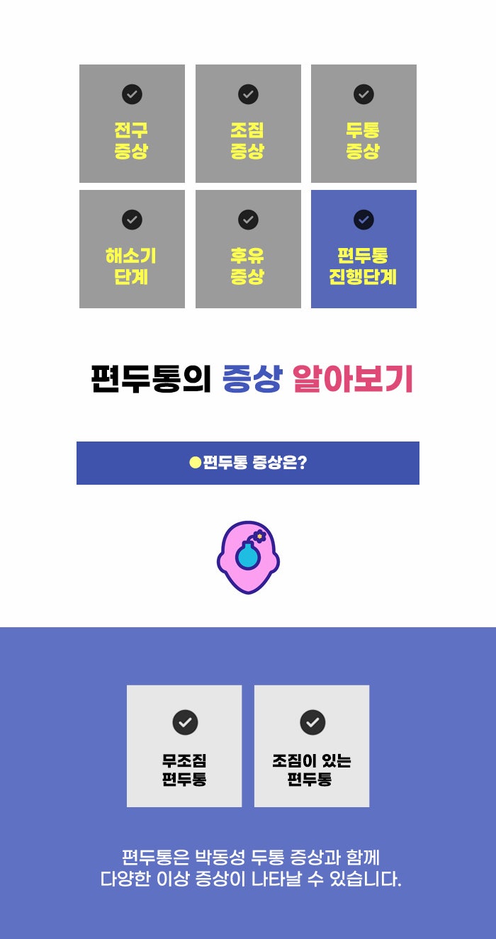 그리고 전구증상, 조짐, 두통과 동반증상, 해소기, 이후의 후유증상 5단계로 편두통의 증상 진행을 구분해 볼 수 있다고 하는데요. 그중에서 조짐이 동반되지 않는 무조짐 편두통이 편두통의 가장 흔한 유형으로 꼽힌다고 합니다. 전구증상은 두통 시작 2~48시간 전에 나타나는데요, 피로감, 하품, 집중력 저하, 감졍 예민, 식욕 부진이나 음식에 대한 갈망, 졸림 등의 증상이 나타날 수 있다고 합니다.