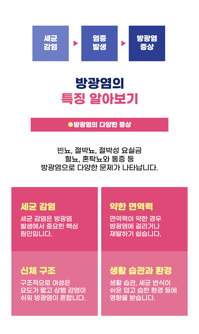 급하게 소변이 마려워지고 참기 어려워지는 증상을 두고 절박뇨라고 하는데요, 이 요절박 증상이 심해지면서 절박성 요실금 증상으로 이어지는 경우도 있다고 합니다. 또한 방광 안에만 염증이 국한되지 않고 증상이 악화되고 감염이 퍼질 가능성도 존재하는데요. 그렇기에 방광염이 의심되는 분이라면 그냥 참지 말고 빠르게 문제를 파악해 대처하셨으면 합니다.