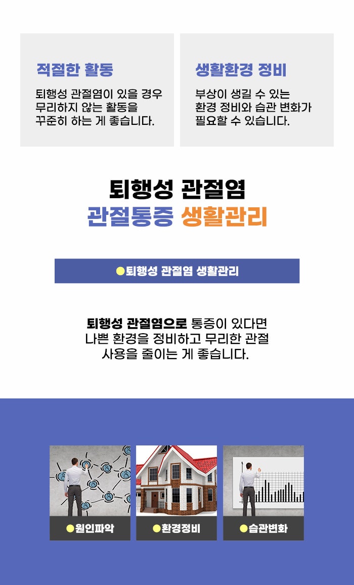 이런 경우 적절한 대응을 하며 이전의 생활로 돌아갈 수 있도록 노력하는 게 필요합니다. 특히 개인의 노력과 의지도 중요할 수 있다고 하며, 집으로 돌아왔을 때 아픈 부위에 부담을 줄 수 있는 환경이나 습관 등을 파악하고 이런 것들을 변화시키면서 문제가 되지 않도록 하는 것도 중요하다고 합니다. 퇴행성 관절염이나 통증이 있는 분의 경우 관절, 척추에 부담을 주는 동작을 할 때 부담이 분산될 수 있게 집에 손잡이 등을 설치하기도 합니다.