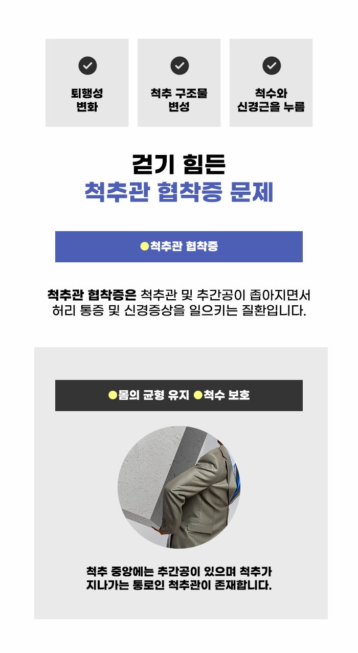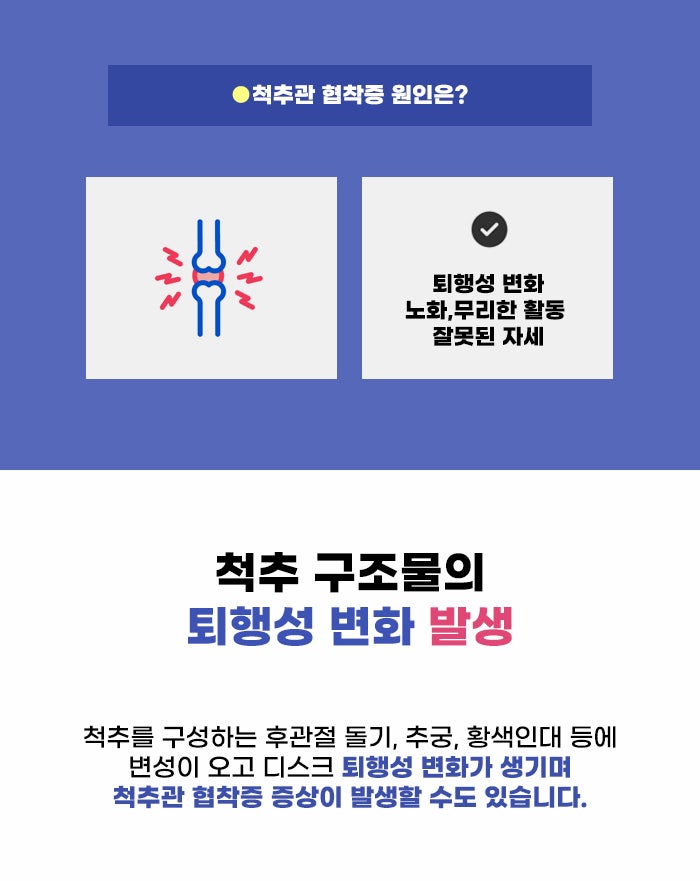 척추는 단단한 뼈이며 몸의 전체적인 균형을 유지하는 기둥과 비슷한 뼈입니다. 그런데 이 척추는 뇌에서 나온 신경다발인 척수를 보호하는 중요한 역할도 하는데요. 그런데 척수가 지나는 통로인 추간공, 척추관이 좁아질 경우 척추에도 압박이 생기고 손상이 생길 수도 있습니다. 척추 퇴행성 변화로 인해 추간공이 좁아지며 통증, 신경 증상이 생기는 게 척추관 협착증이라고 합니다.