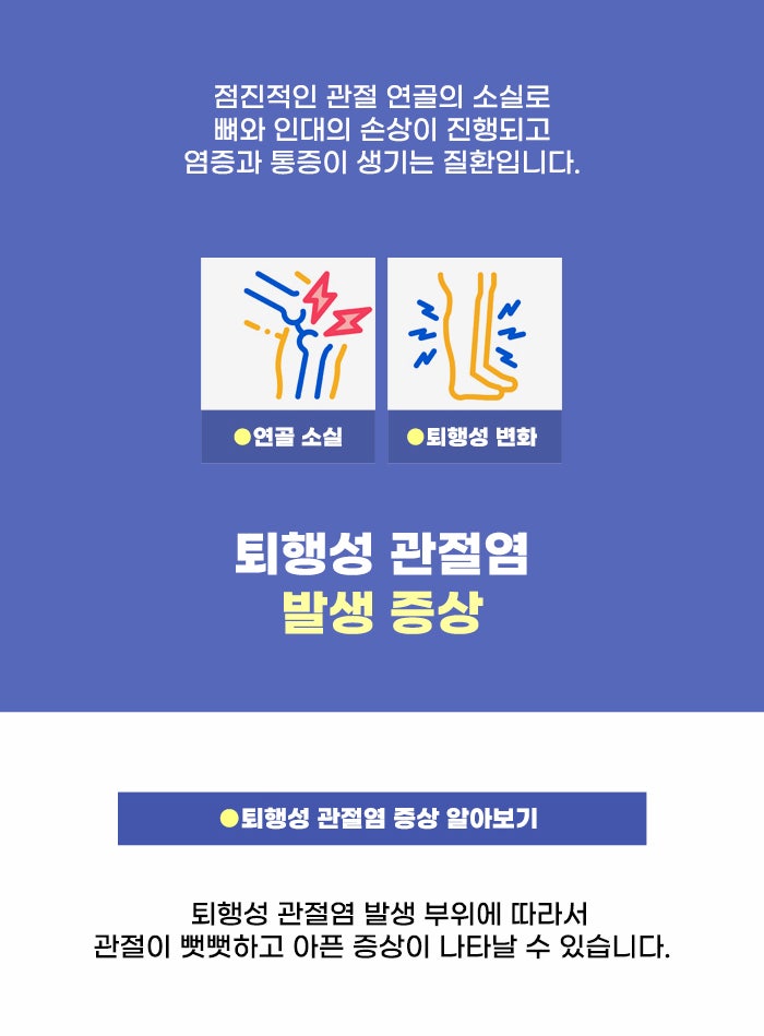 관절이 움직이고 안정적으로 유지될 수 있도록, 관절은 단순히 뼈와 뼈만으로 이루어진 부분이 아니라 여러 관련 구조물이 존재합니다. 그리고 관절 사이에는 활액이 있으며 부드러운 연골이 존재합니다. 이 연골은 단단한 뼈가 직접 부딪혀 상하는 일이 없도록 억제하는 역할을 하는데요. 관절을 사용하며 연골이 소실되고 닳을 수 있습니다. 그리고 이렇게 연골 소실로 인해 생기는 관절염이 퇴행성 관절염이라고 합니다.