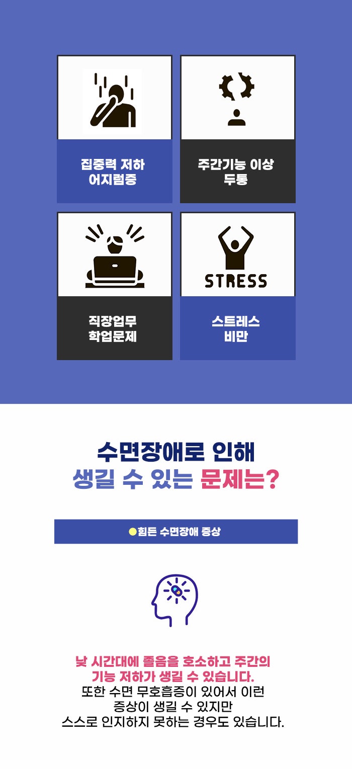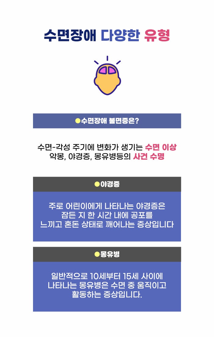 잠을 자려고 누웠는데도 잠이 오지 않아 걱정하거나, 긴 시간을 들였는데도 잠에 들지 못해 힘들다면? 수면장애는 잠과 관련되어 생기는 여러 문제를 말하는데요. 그중에서 불면증 문제가 많은 사람에게 알려진 수면장애 문제일 것 같습니다. 불면증이라고 하면 수면 시간이 부족한 것만을 떠올리는 분도 있습니다.