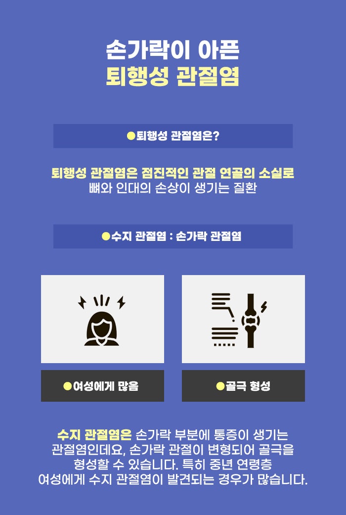 관절 질환 중 많은 분이 겪고 있는 유명한 관절 질환으로 퇴행성 관절염이 있습니다. 이 질환의 이름은 많은 분이 들어보셨을 것 같은데요. 이미 많은 분이 들어본 적이 있는 만큼, 이 질환을 겪는 분도 많습니다. 퇴행성 질환이라는 특성상 중년 이후 연령대에서 많은 편인데요. 고령화가 진행되면서 퇴행성 관절염의 발병률도 높아지는 것 같다고 합니다. 그리고 특히 수지 관절염은 중년 연령층에 속하는 여성에게 많이 발견되는 문제라고 합니다.