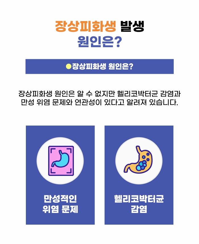 위 안의 염증반응이 오래 이어지면서 위 점막의 정상적인 구조물이 파괴되는 상태가 될 수 있기 때문인데요. 정상적인 위 점막 세포, 구조물의 파괴가 이루어지고 그 자리에 소장이나 대장의 점막과 유사한 세포가 생길 수 있습니다. 이 상태를 두고 장상피화생이라고 합니다. 장상피화생의 명확한 발생 요인은 아직 알려지지 않았다고 하는데요. 헬리코박터 파일로리균 감염과 이로 인해 생기는 만성 위염 상태와 관련이 있는 것으로 알려지고 있는 것 같습니다.