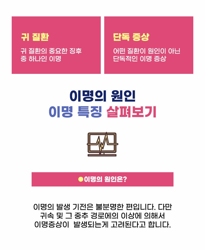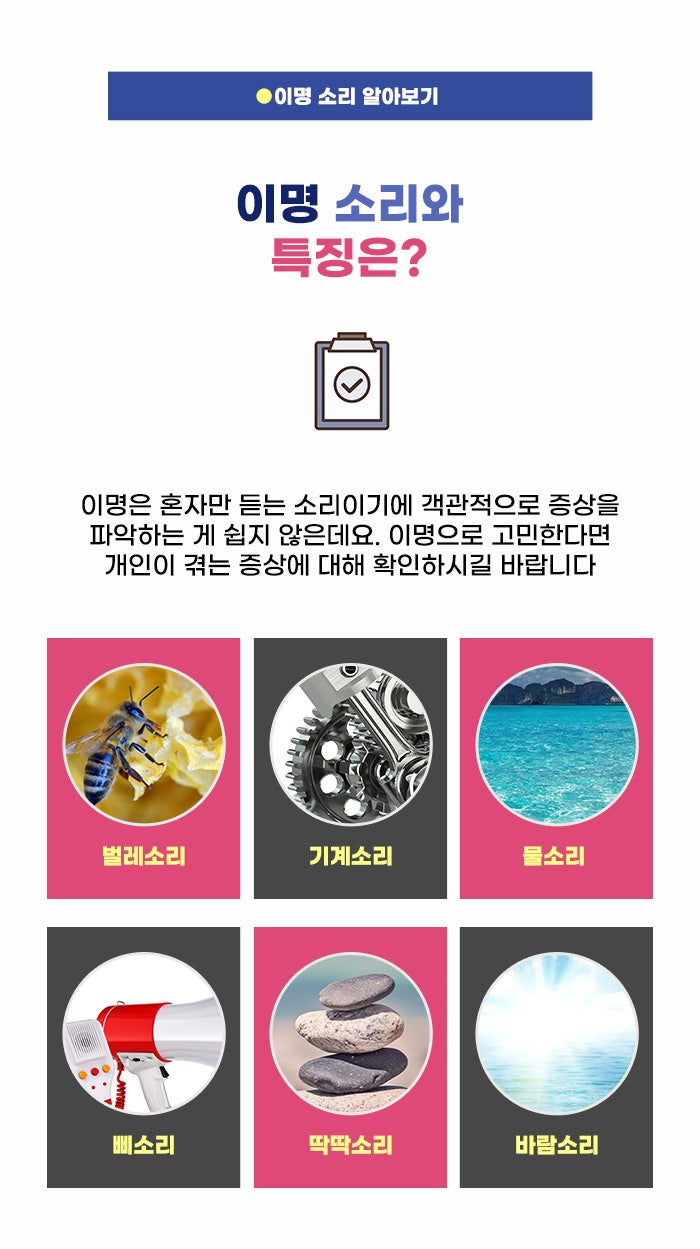 시간이 지날수록 내 몸에 생기는 이상, 고민이 더 커질 수 있기에 되도록 빠르게 나의 고민을 파악하는 게 필요할 것 같은데요. 반복되는 이명을 방치한다는 것은 이명 증상을 키운다는 뜻일 수도 있습니다. 그리고 이명을 불러온 원인, 귀 관련 질환을 방치하는 것일 수도 있다고 합니다. 이명은 원인 파악이 쉽지 않은 만큼, 세밀하게 문제를 알아봐야 하겠습니다.