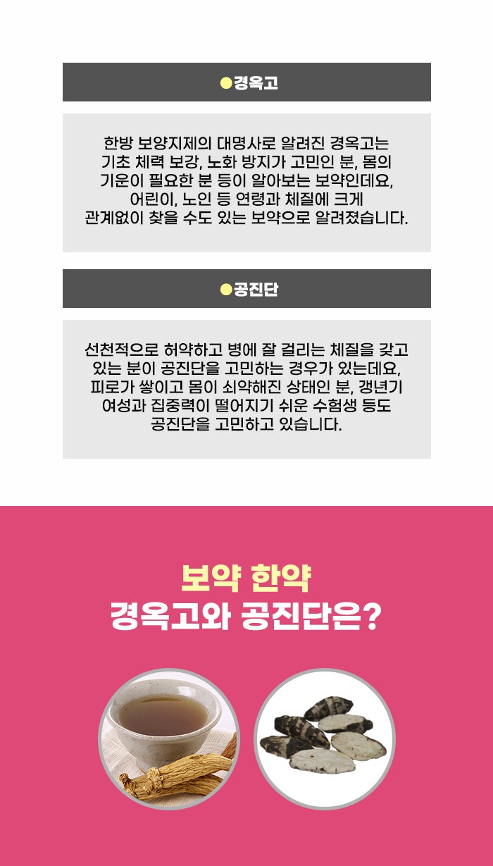보약이란 몸을 보하는 약이라는 뜻을 담고 있다고 알려져 있습니다. 특히 공진단, 경옥고에 대해서 알고 싶어 하는 분이 많은데요. 경옥고는 동의보감에 언급되고 있으며 한방 보양지제의 대명사로도 알려져 있다고 합니다. 특히 피로가 쌓인 상태이고 기초 체력 보강이 필요할 때, 갱년기에 들어선 여성분이나 기력이 쇠하기 쉬운 고령층이 경옥고를 찾기도 합니다.