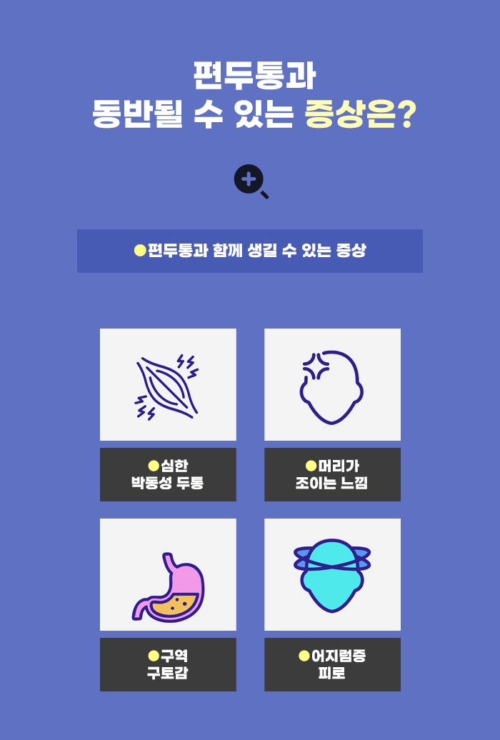 편두통은 박동성 두통이 강하게 나타나는 게 특징인 두통 문제라고 하는데요. 구역감이 생기거나 혹은 편두통 문제와 함께 구토 증상이 생기는 분도 있습니다. 그리고 편두통으로 소리나 빛에 예민하게 반응하고 힘들어하기도 합니다. 그렇기에 편두통 증상이 있는 분의 경우 요란한 음악 소리가 흘러 나오거나, 눈부신 빛이 현란한 조명이 있는 장소 등을 피하기도 합니다.