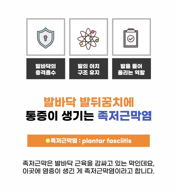 걷고 뛰면서 체중이 실린 상태에서 발을 들어 올려야 하는데요. 이런 발의 역학에서 중요한 역할을 하는 게 발바닥의 막이라고 합니다. 족저근막은 발을 들어 올리고, 발의 아치를 유지하는 것 같은 역할을 하는데요. 이 족저근막의 위치는 발뒤꿈치에서 시작해 발가락이 시작되는 부분과 닿아 있다고 합니다. 족저근막에 이상이 생길 경우 발의 통증이 생기고 걷는 데도 지장이 생길 수 있습니다.