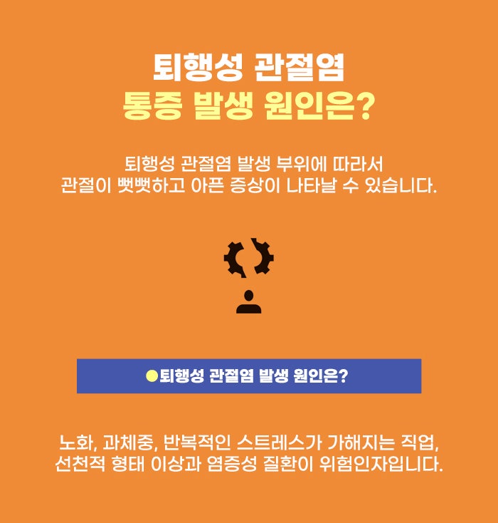 많은 분이 겪는 질환인 만큼, 퇴행성 관절염에 대해서 알고 대비하는 게 좋겠습니다. 잘못된 운동, 무리한 노동, 염증성 질환 등의 문제, 잘못된 생활 습관과 자세 등이 퇴행성 관절염 문제를 불러올 가능성이 있습니다. 그리고 노화는 퇴행성 관절염의 중요 발생 원인입니다. 특히 중년 이후, 고령층에게 이 퇴행성 관절염 문제가 흔한 편이라고 하는데요. 통증이 있다면 무리한 활동을 자제하고, 또 꾸준히 적절한 운동을 하면서 건강을 유지하기 위해 힘썼으면 합니다.