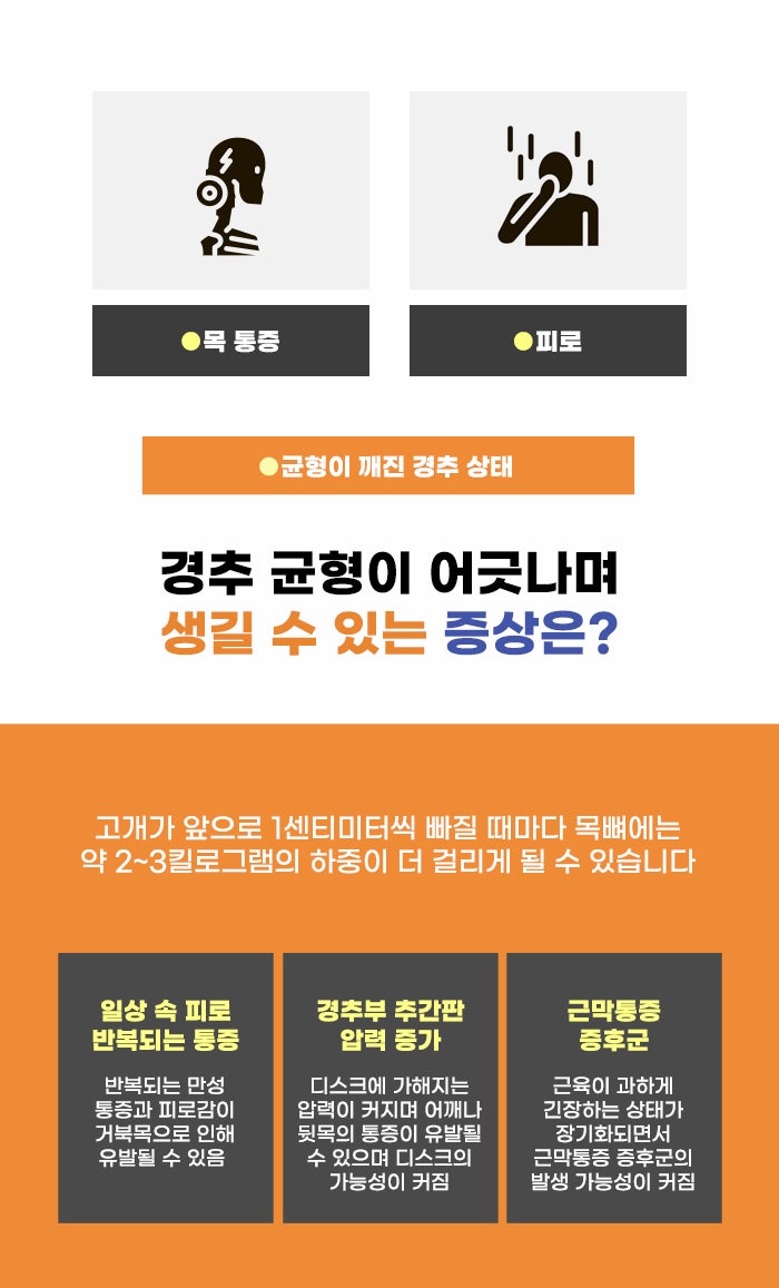 경추는 무거운 머리의 무게를 견디고, 외부의 충격을 분산시키기 위한 역 C자 커브를 갖고 있는데요. 이 정상적인 경추전만 곡선이 깨진 상태를 두고 일자목, 거북목이라고 합니. 경추 곡선이 깨지면서 만성 통증, 근막통증 증후군이 생길 가능성도 있다고 하며, 오랜 시간 경추에 부담을 주면서 목 디스크 증상을 걱정할 수도 있습니다.