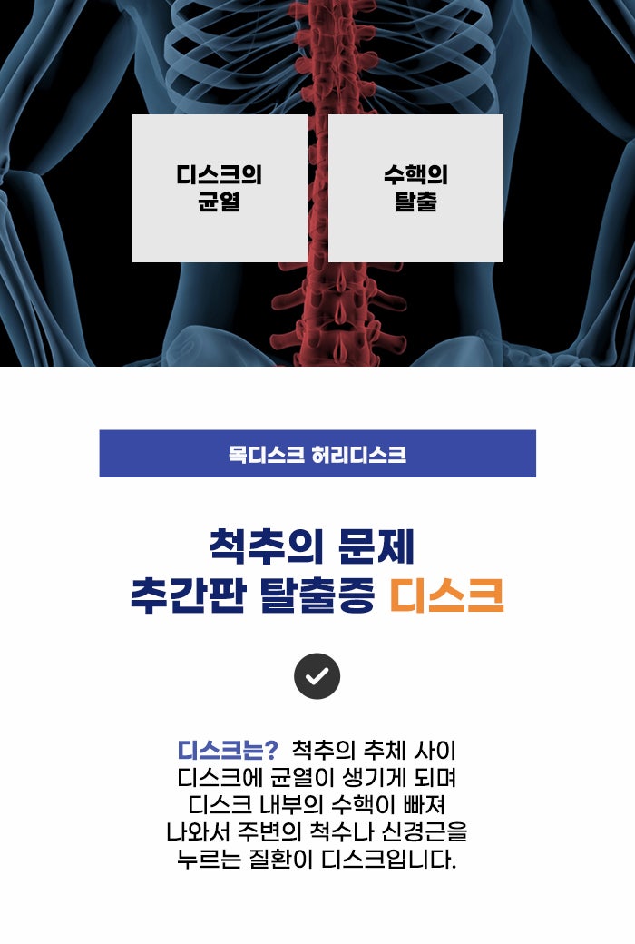 경추 추간판 탈출증 외에도 추간판 탈출증이 흔히 생기는 부위는 허리 부분인 요추입니다. 허리 디스크가 생길 경우 강한 허리 통증과 하지 방사통, 저림 등이 생기기도 하며 근력 약화 증상이 생기기도 합니다. 이런 증상은 요추 척추관 협착증과도 닮은 점이 있는데요. 다만 신경인성 간헐적 파행증이 생기는 게 척추관 협착증의 특징이라고 합니다. 신체 노화, 외부 충격도 척추 질환에 영향을 주지만, 평소 생활 습관, 잘못된 자세도 통증을 불러올 수 있는데요. 척추 질환이 의심된다면 바른 자세를 찾을 수 있었으면 합니다.